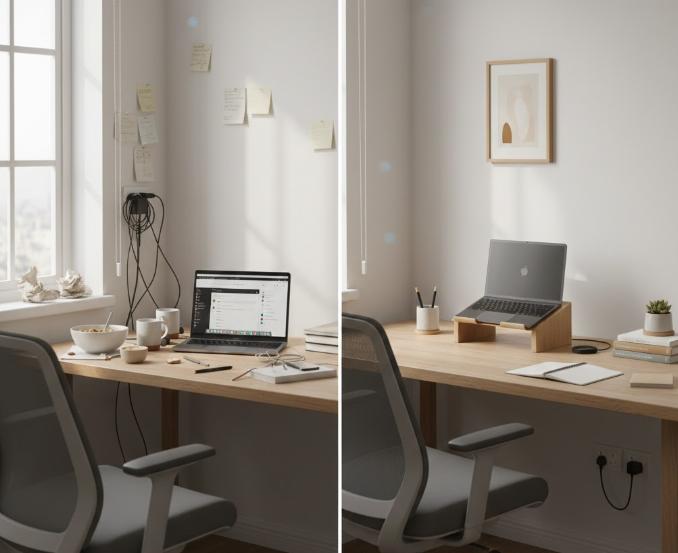 Escolha uma única superfície — a mesa do escritório, a bancada da cozinha, o criado-mudo. Esvazie completamente. Limpe. E devolva apenas o que é útil ou tem significado real.